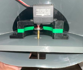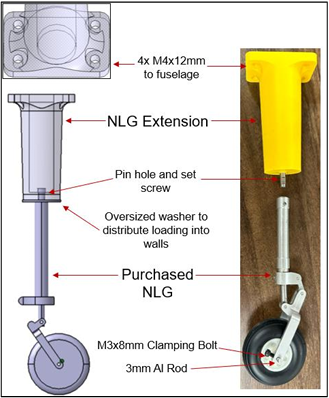The design used quickly obtainable parts including a D-profile rotary shaft, aluminum servo horns, circular adhesive ready nuts, a shaft collar, and thread adapters, all to transmit servo torque from within the nose of the aircraft linearly to the NLG. To mount the servo within the nose of the aircraft, a modular, variable-height, design was created to facilitate easy reponsitioning of the servo relative to the ground in the event of a under- or over-sized cut on the shaft.