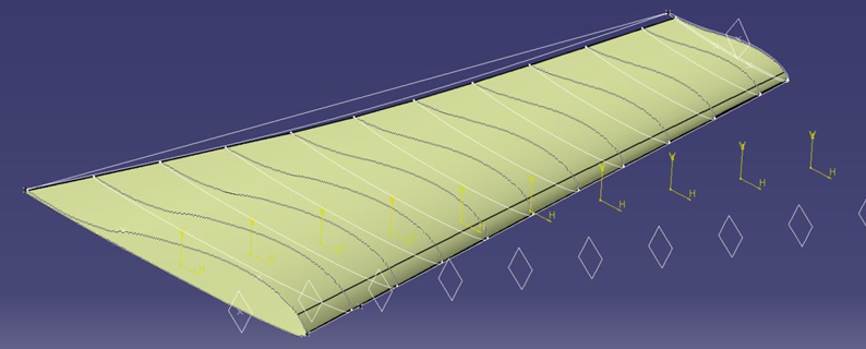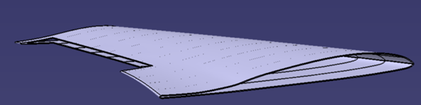 Using the source airfoil geometry, the wing was reconstructed from scratch using the Generative Shape Design workbench in Catia. The solid wing was reconstructed with simple boolean operations to remove an internal wing profile from the external wing solid. This thickness of the wingskin was assigned to a variable to facilitate future adjustments.